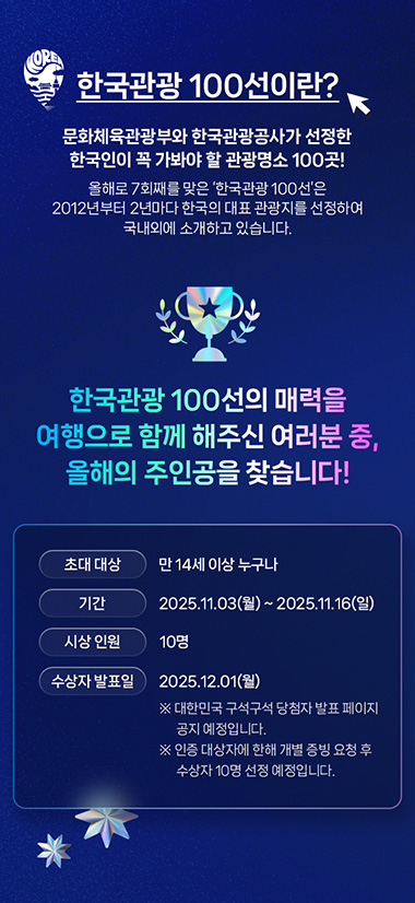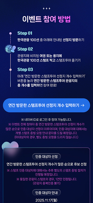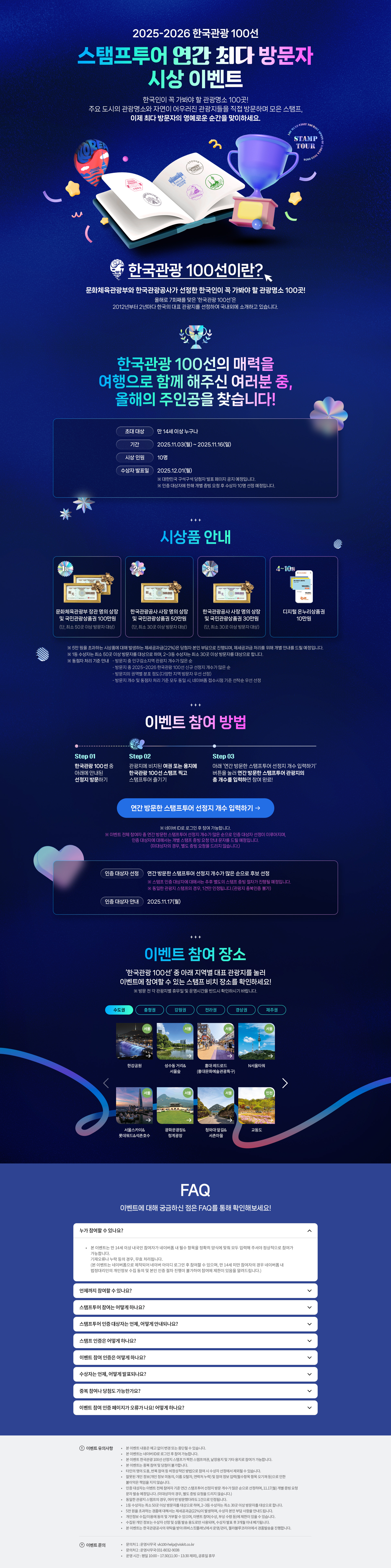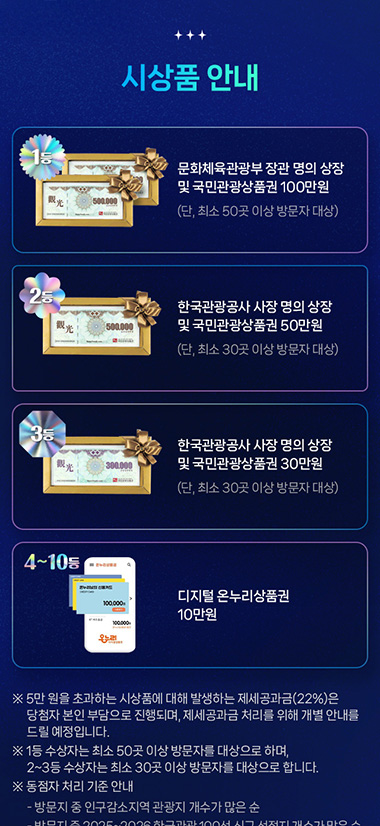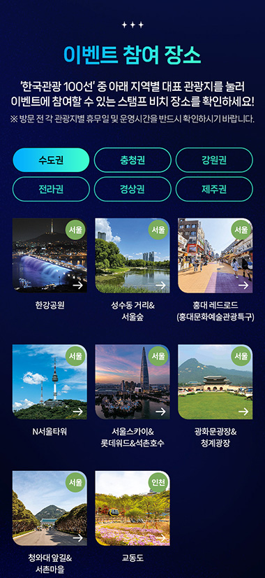 · 한국관광 100선 관광지 홍보 및 방문 활성화 목적 스탬프투어 이벤트 기획/제작/퍼블리싱